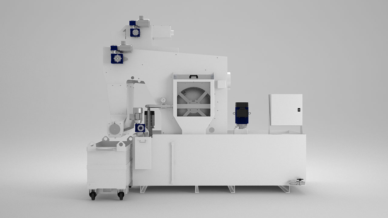 | A tömörített iszap eltávolításra kerül, a kinyert folyadék pedig egy leeresztő csövön át távozik. |
