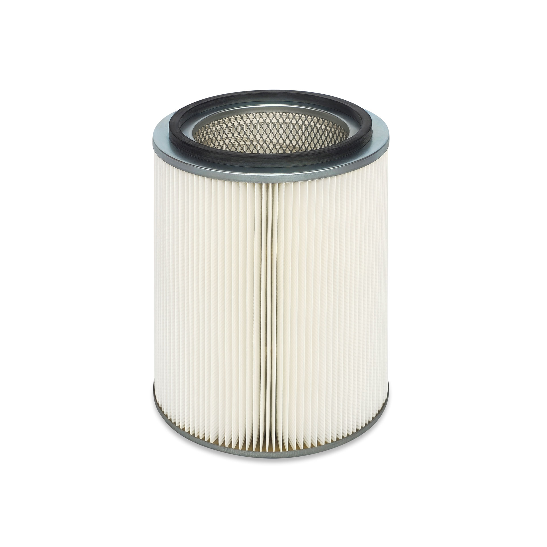 Leistungsstarkes Abreinigungsfilter aus Polyestervlies mit auflaminierter ePTFE- Membran und einer Filterfläche von 4 m². Durch die mikroporöse Membran werden auch besonders feine Stäube direkt an der Filteroberfläche abgeschieden und lassen sich gut wieder abreinigen. Die Filterpatrone entspricht Staubklasse M, geprüft nach DIN EN 60335-2-69:2010 Anhang AA, und erreicht einen sehr hohen Abscheidegrad von ≥ 99,9 %. Die Filterpatrone ist an der Oberseite offen, der Boden ist bis auf eine 13 mm große Bohrung für die Befestigung geschlossen. Das Filtermedium ist oben und unten in Kunstharz vergossen. Ein spiralförmig um den metallischen Stützkorb gewickeltes Gurtband verhindert den Kontakt zwischen Filtermedium und Stützkorb, ermöglicht aber die nötige Beweglichkeit für eine Abreinigung mittels Rotationsdüse.